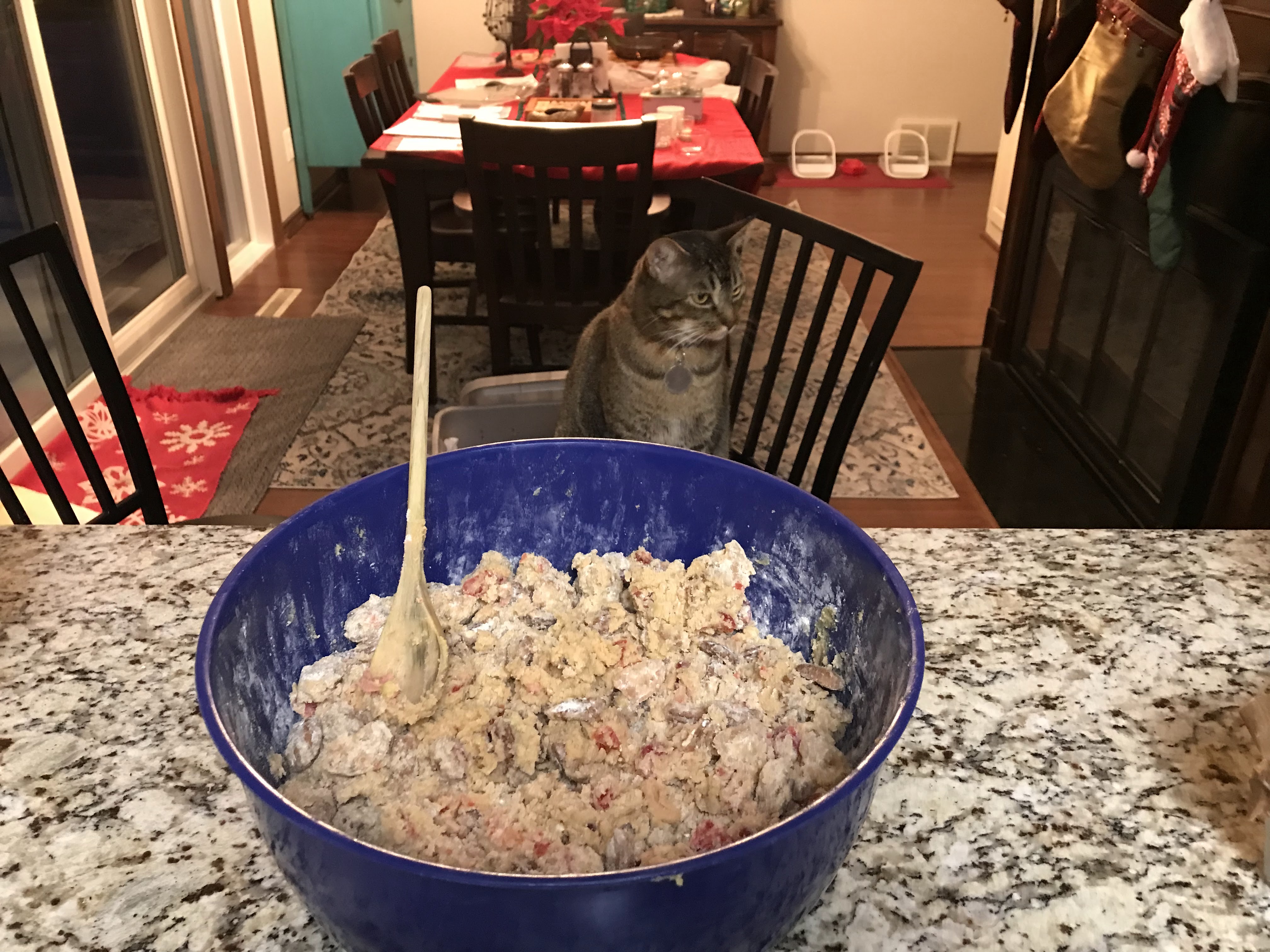 5) NOTE: The batter is very stiff. I had my husband help me to stir and also used the very largest bowl I had in my kitchen. You can see my cat, Felix, who loves to be involved in all the action. I would recommend you have someone strong around to help with the stirring.