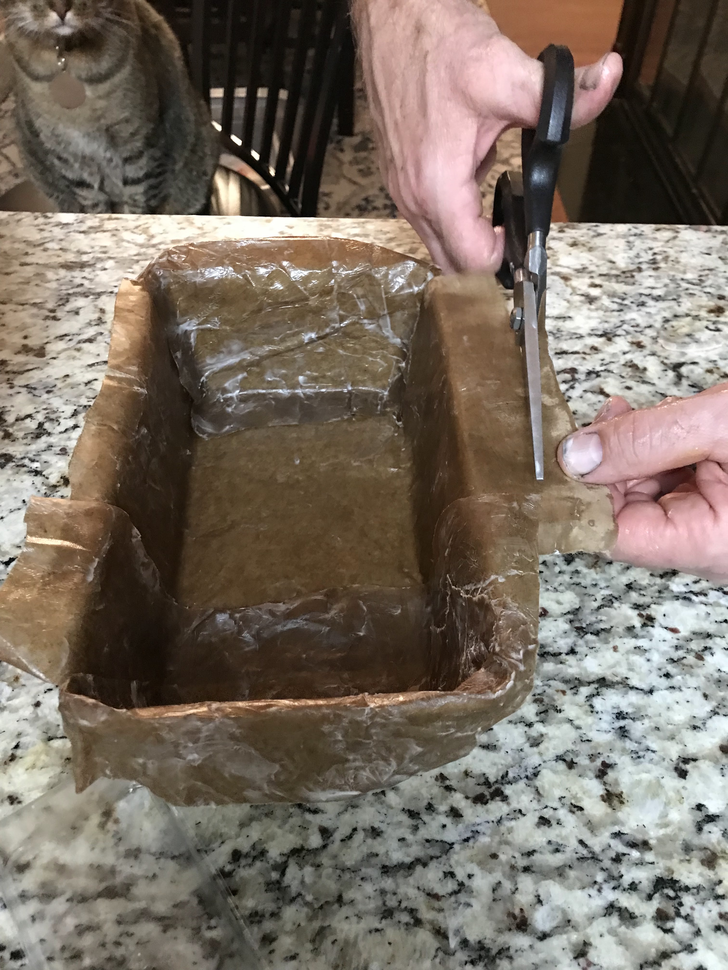 3) Grease loaf pan with shortening. I used Crisco. You can also use Angel food pans. Grease brown paper on both sides and line pan. It is difficult to get paper pressed down into pan; press by sections.